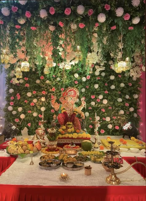 A Serene and Elegant Floral Theme Celebrate Ganpati with a soft and serene floral setup, where delicate pastel-hued flowers create an aura of peace and devotion. The idol is nestled among layers of white lilies, baby’s breath, and soft pink carnations, exuding a calming and divine energy. Banana leaves and mogra garlands add a traditional touch, while floating diyas in flower-filled water bowls create a magical glow. This floral decoration is simple yet breathtaking, offering a perfect balance between elegance and devotion, ensuring that Lord