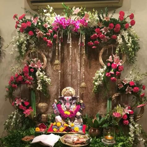 A Soft and Elegant Floral Glow This Ganpati setup embraces a softer, pastel floral theme, creating a serene and elegant atmosphere. Lord Ganesha is seated amidst a backdrop of delicate pink and white carnations, baby’s breath, and soft peach roses, evoking a sense of peace and divine grace. Subtle golden fairy lights twinkle through floral garlands, adding a warm, celestial glow to the setting. The traditional touch of banana leaves and fresh jasmine strands enhances the sacred feel, while a pathway lined with rose petals and diyas leads to the altar, inviting devotees into a space of prayer and positivity. This floral decoration is perfect for those who seek a refined, graceful, and soothing aesthetic for their Ganpati celebration.