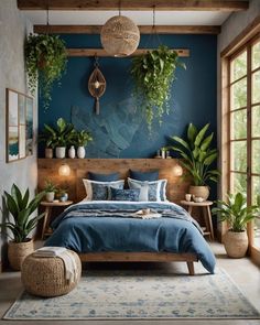 bed room with blue background, A Tranquil Green Retreat