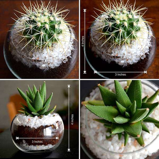 You can decorate your house with Desert in the small glass bowl, which contains a beautiful combination of one cactus and one Haworthia succulent in the separate spherical container.