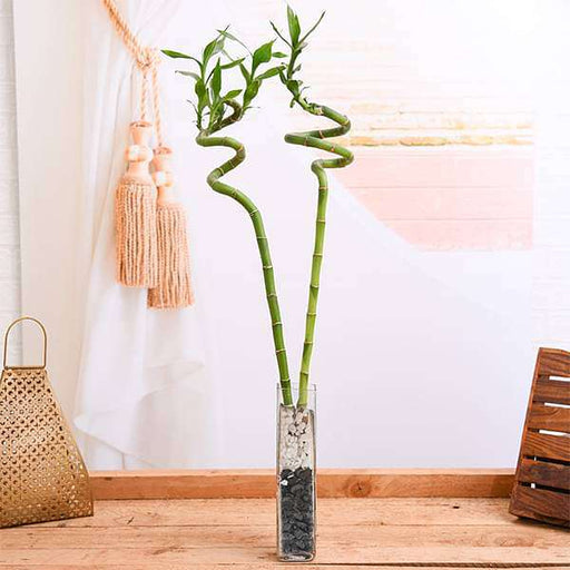 Set of 2 Spiral Sticks Lucky Bamboo in a Square Glass Vase with Pebbles